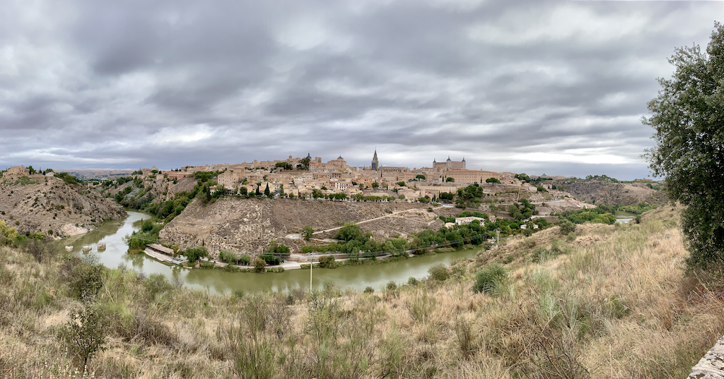The ride was smooth until after we did the shopping for dinner tonight and then found ourselves on a sandy track amongst a very old olive tree grove meaning that we had to push these heavy bikes through sand. Not easy and very slow. We eventually made it on to dirt track again and then eventually sealed road. At that point we were almost at our campground in Toledo. Next to one of the mythic rivers of Europe – the Tagus river. As we rode in we could see Toledo perched up proud on the mountain. Even from a distance it oozes so much charm. The biggest disappointment in Spain, as in Italy, has been the tonnes and tonnes of rubbish we have encountered by the roadside. Tyres, plastic bottles, aluminium cans, shoes, clothes, broken plastics, glass – everything you could possibly imagine. How did it get so bad? The state of rubbish on land and in water. Thousands of kilometres, tonnes of rubbish. Is this the peak? Will we change at this point? Leaving Madrid and going through the southern once upon a time industrialised suburbs, including Fuenlabrada which Lisa recognised as the place she stayed with Suzie when she last came to Madrid in 1996, was not a promising site. Rubbish and clothes thrown haphazardly on the streets surrounding industrial areas. It was so desolate, so trashy with the hot, quick, cheap and dirty hotel to go by the roadside, bringing down any sense of human dignity with it.