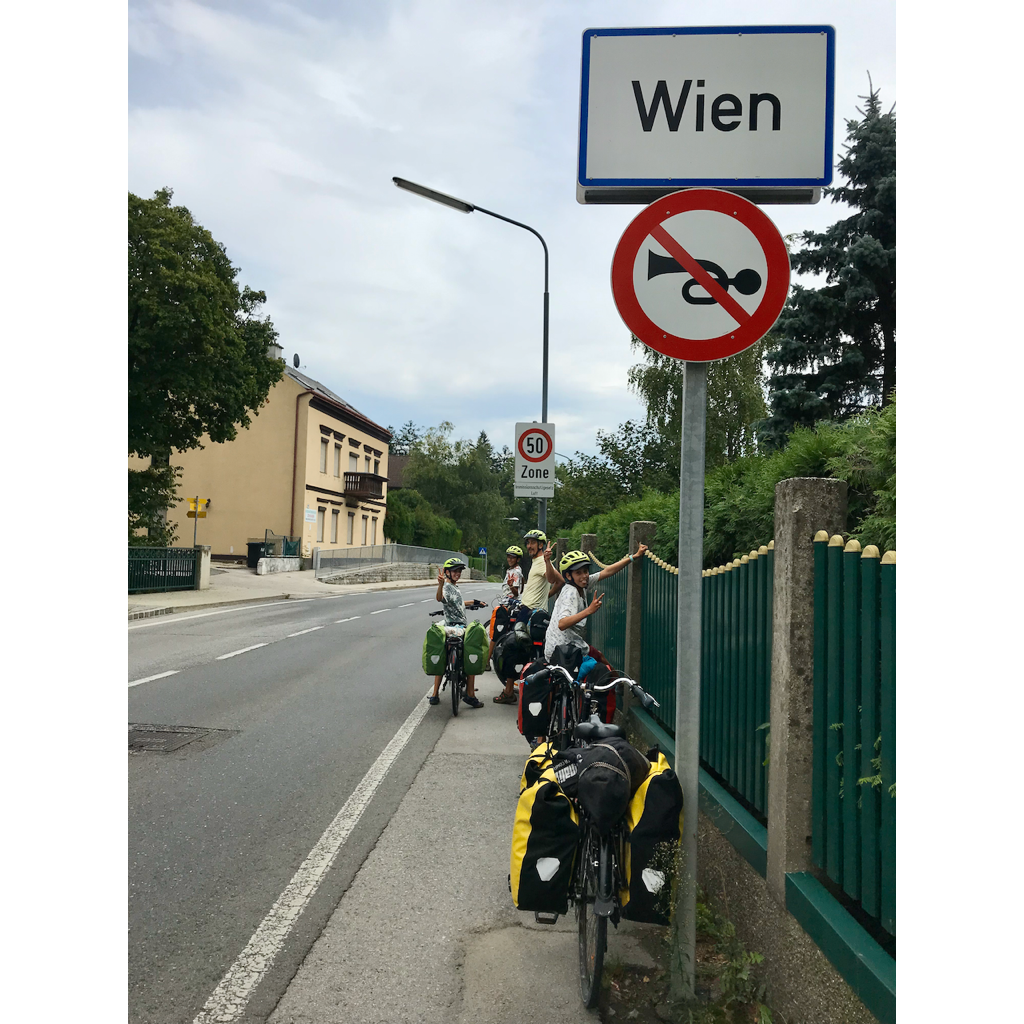 We rode some 70kms but we were hard up against this awful wind that has not gone away since we crossed over into Austria. The wind was cursed today on several occasions. It’s that constant sound that fills your ears, coupled with the pushing that just makes it absolutely exhausting. We’re all starting to feel delirious it seems. We stopped by the roadside because our butts were burning. We’re not exactly sure why our butts are still sore after seven weeks. Perhaps it’s the amount of time we’re in the saddle. Perhaps it’s just all the pushing. Xavier laid down on the grass and fell asleep instantly while the boys went to the bush toilet and were testing which of the three had the healthiest poo! This they measured by the number of flies attracted. Meanwhile Lisa sat on a bench and was trying to stretch out the sore shoulder and massage a sore butt. What a family scene. We arrived at a quiet camp ground and met a Spanish couple from Madrid. Being Sunday we went to the nearest restaurant for dinner and were in bed at 8pm. Tomorrow we arrive a day early in Vienna. Something we are all very much looking forward to after being 16 days non stop on the road. Having the warmth and comfort of a friend’s hospitality is uplifting.