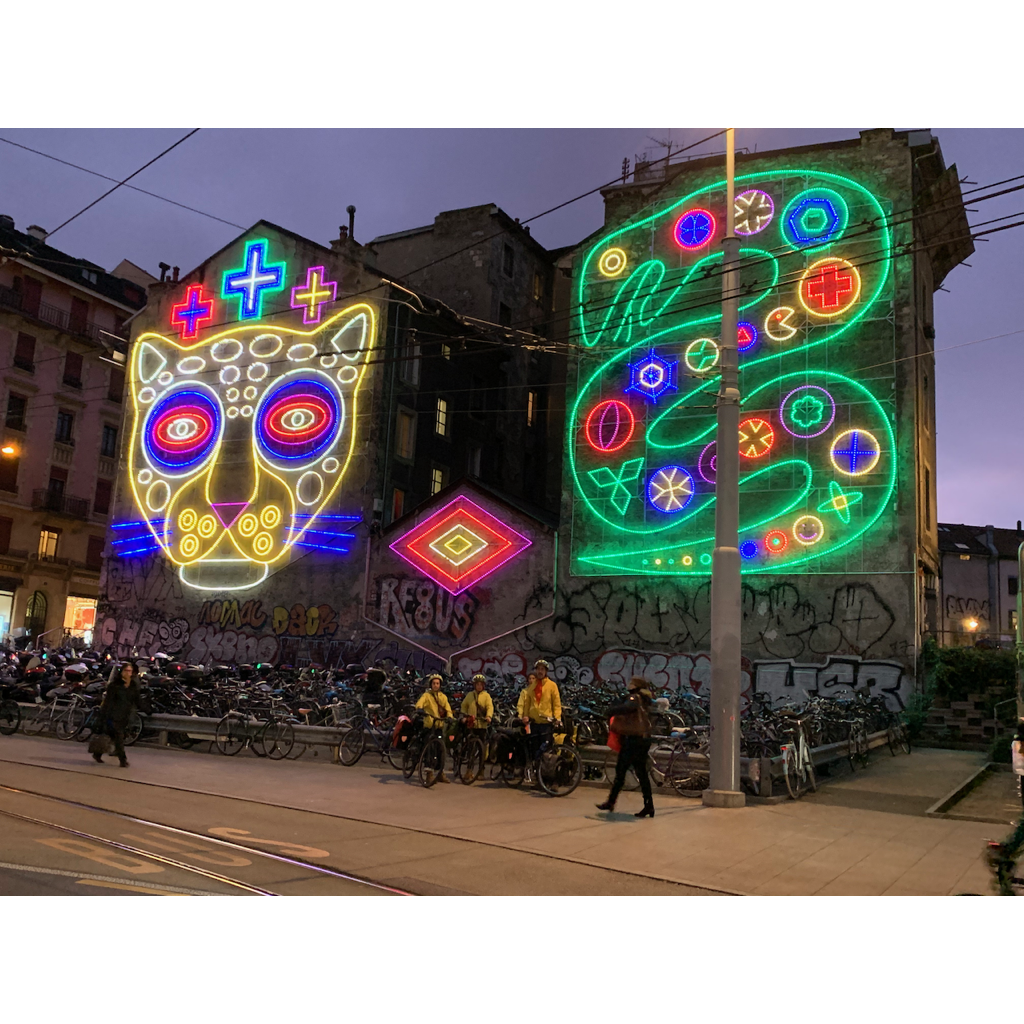 We started shuffling, collecting our belongings, preparing our bags, all of this dotted with bursts of excitement from Xavier about where we were. The train pulled into Geneva Cornavin and we were in love. We were greeted by Fred’s public artwork up in lights, just as we left it. We almost didn’t feel the cold when we reached the platform. We made our way through a deserted customs and we were back in Geneva – at Rue des Gares!