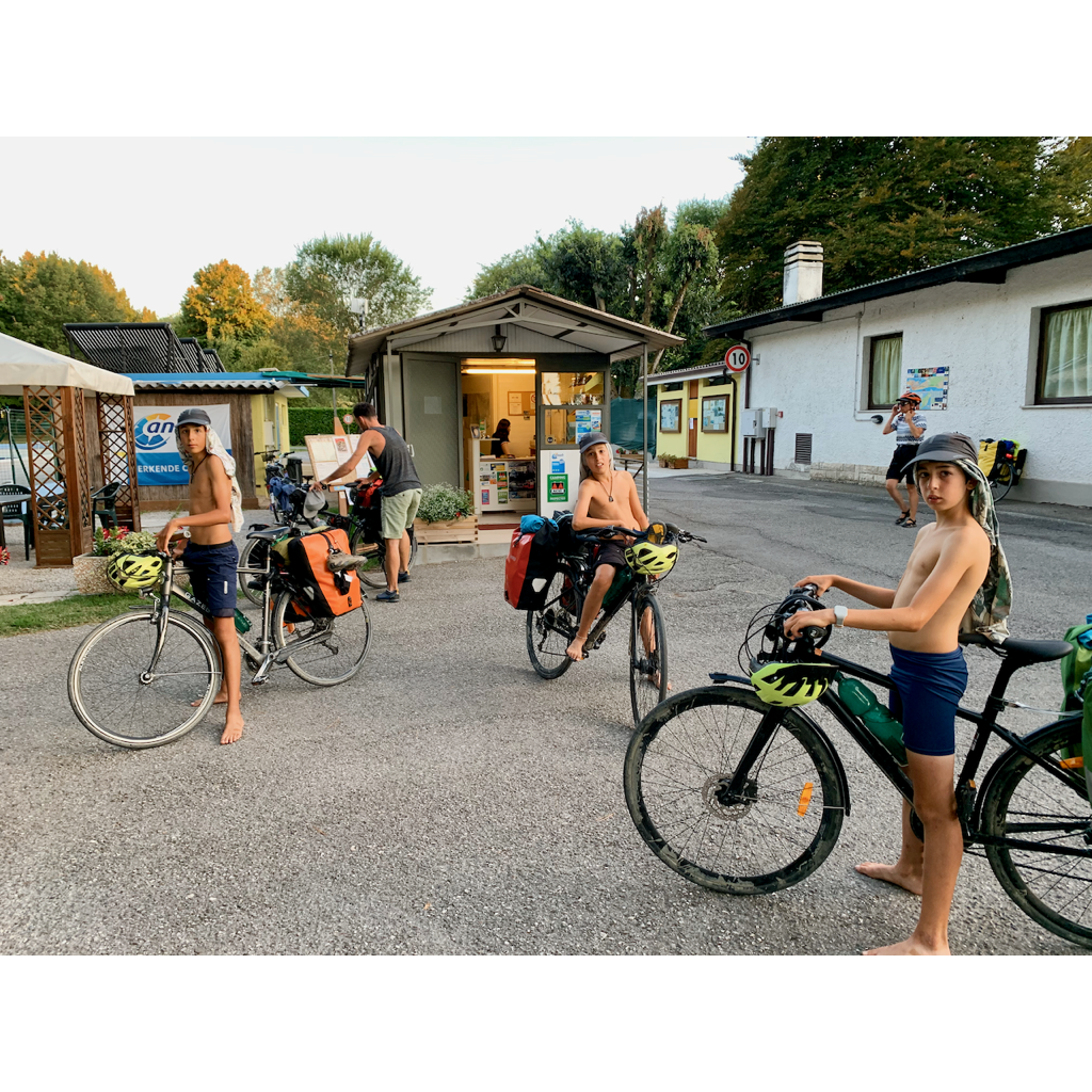 Back on the road the plan was to ride to Grado and camp in Aquiliea where the camping was cheaper. What an incredible ride. We had a 180 degree view of the Alps in the distance that stretched from France to Switzerland to Austria and Slovenia. Nanos was there the whole time too. Just incredible. The boys were able to locate where we were based on that and recalled memories of when we were ‘on the other side’ in Switzerland just after leaving Bern. The most magical scenery to behold – surrounded by these incredible mountains, while riding through the lagoons of Grado. It just can’t be more enlightening than this.
